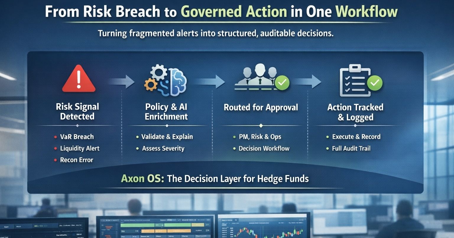 Axon OS enables hedge funds to transform fragmented risk and operational signals into governed, auditable decisions with structured workflows.