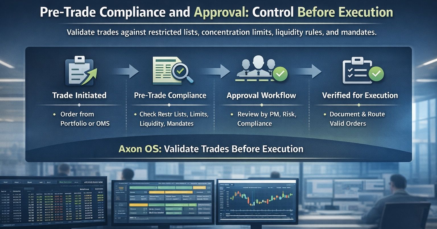 Axon OS ensures every trade is validated against compliance rules, mandate constraints, and risk policies through governed workflows before execution
